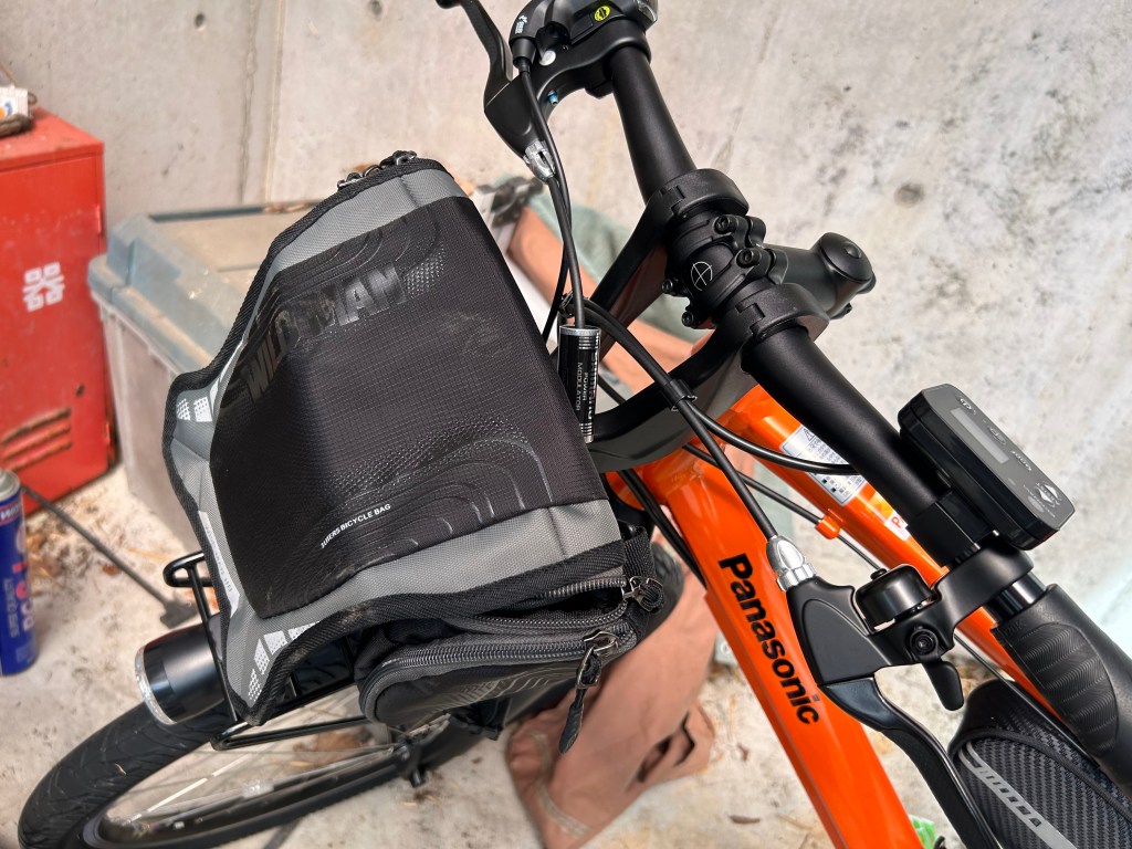 やはりAmazonで購入。WILD MANというメーカーらしいが商品名のわからないフロントバッグ。寿限無みたいな、タイトルだか能書きだかわからん呼称は、ときに不便なこともありはしないか。ともかくも装着する。シフターやブレーキのケーブルをよけるのに工夫が要ったが、ケーブル類の下をくぐらせればなんとかなる。