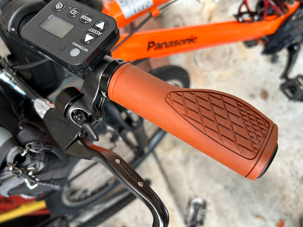 購入時のグリップはネジ止めも接着もされていないので、ただ単にナイフでハンドルにそって割を入れたら簡単に外れる。むろん再使用はできなくなるが、どのみちそのつもりはない。あとは新しいグリップをはめてネジ止めするだけだが、作業時には、左右のブレーキやグリップシフトあるいは電動アシストの操作盤を、六角レンチやドライバーなんかで固定を緩めてたしょう内側に寄せる必要がある。新しいグリップを装着したあと、これらの装置の位置を戻して完成。左側のブレーキや操作盤の位置取りは問題なかったが、右側はグリップシフトが幅をとるので、新しいグリップがハンドルの端から数mmはみ出していた。エンドキャップをしっかりはめたら分からなくなった。