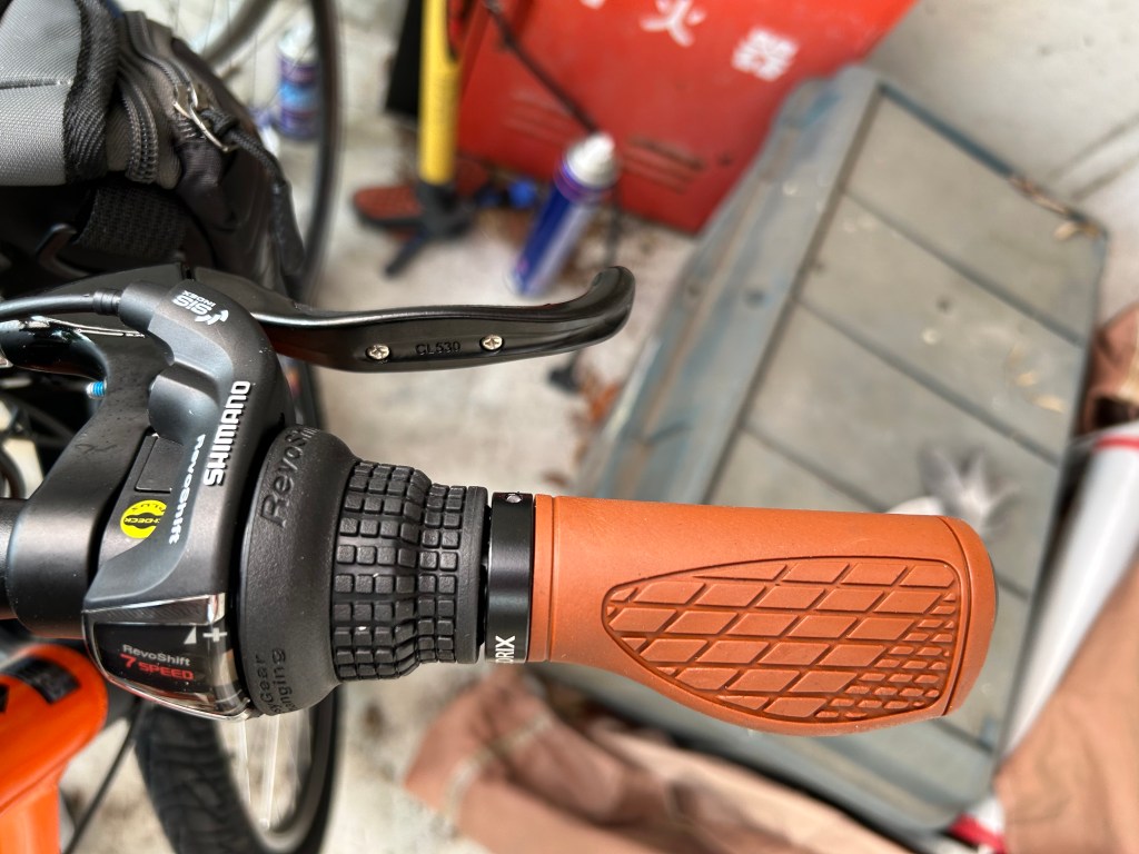 購入時についてきたグリップはまるで衝撃吸収性能がなく、ハンドルを握った印象はひたすら硬く、小刻みな振動がひっきりなしに伝わってきて不愉快だった。Amazonで衝撃吸収をうたったエルゴグリップを見繕って購入。直接握ってみた印象は従来のものとそれほど違うかよくわからなかったが、付けかえて走ってみると不愉快な振動がぴたりと止まった。